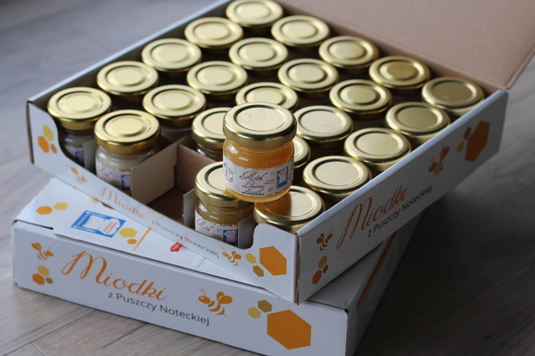25 sztuk miodu po 40g w pudełku. Po rozłożeniu pudełka, można je bezpośrednio wystawić na ladę. Polecane dla firm, piekarni, cukierni, kawiarni...
